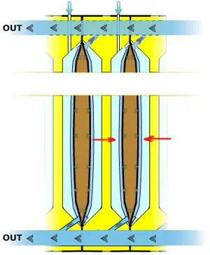 Filtratet/slurryn pumpas in i filtret under högt tryck (ca: 12-15 bar) och de fasta partiklarna fyller upp utrymmet mellan filterplattorna.